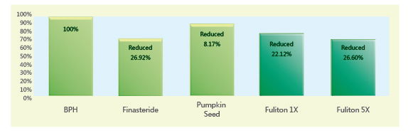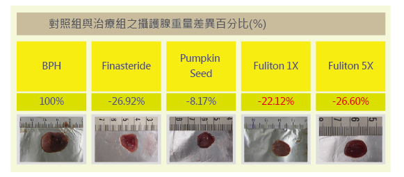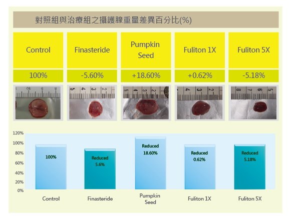 投予睪固酮刺激誘發試驗大鼠攝護腺肥大,經餵食各組試驗物質後,各組之間攝護腺重量差異(如下表):服用臨床用藥Finasteride組,能有效治療攝護腺肥大,其攝護腺重量明顯較對照組(-26.92%);而服用pumpkin seed組,亦有其改善效果,其攝護腺肥大現象較對照組(-8.17%);而服用Fuliton組,在換算一般建議之成人劑量組下,即可達到幾乎與服用臨床用藥Finasteride組一樣效果,其攝護腺肥大現象(-22.12%),在服用Fuliton 5X的建議劑量組則攝護腺重量(-26.60%),兩組Fuliton組試驗(1X及5X)均顯示能縮小試驗大鼠之攝護腺肥大且具有重複性的結果,由試驗動物之結果顯示,「Fuliton」功效不論服用1X或5X劑量,大致與服用臨床用藥Finasteride功效一致,且無其副作用。