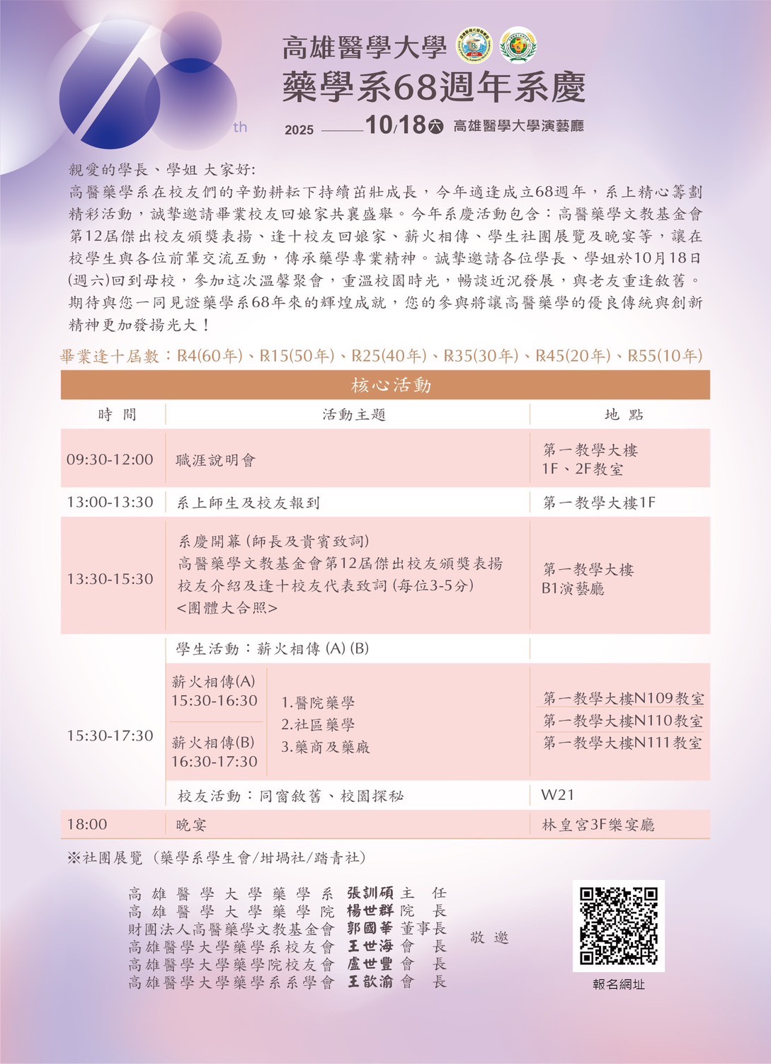 今年系慶活動內容豐富,包括「高醫藥學文教基金會第12屆傑出校友頒獎表揚」、逢十校友回娘家、薪火相傳儀式、學生社團展覽與系慶晚宴等,展現高醫藥學系深厚的人文底蘊與持續精進的教育成果。